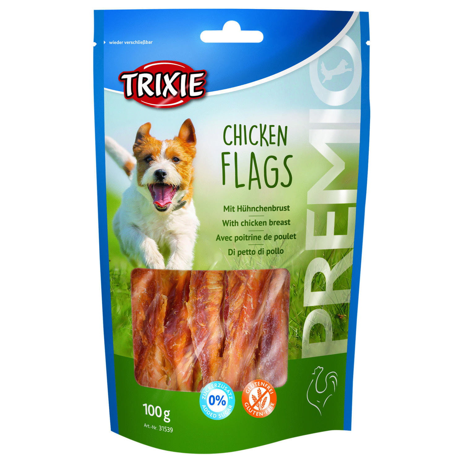 In bepaalde Pets Place winkels vind je de Trixie Snack Bar. Deze snackbar bevat verschillende heerlijke lekkernijen voor je viervoeter. Van donuts en pretzels tot pensstaven, voor ieder wat wils. Eén van die snacks zijn de Premio Chicken Flags. Een heerlijke runderhuid kauwrol met kippenborst. Deze snack heeft een vleesgehalte van maar liefst 65% en is rijk aan proteïnen.