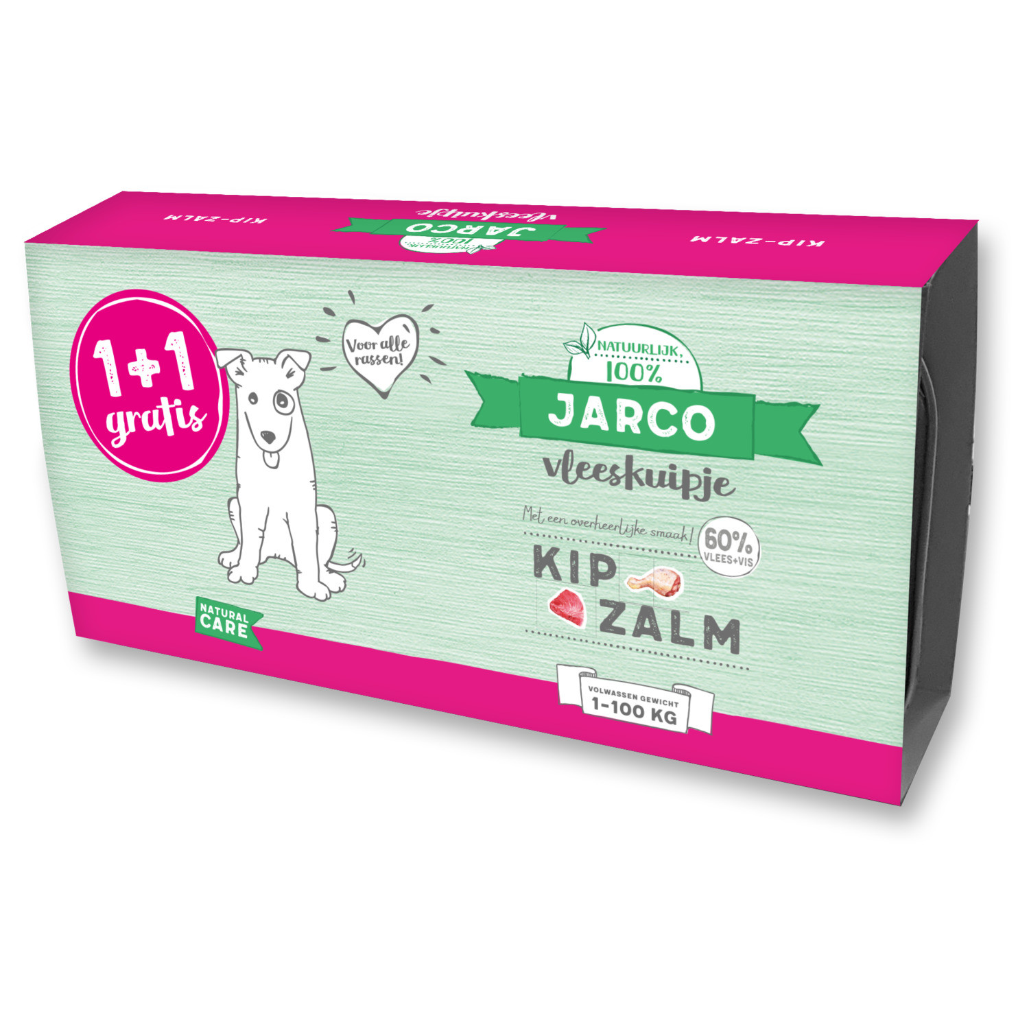 Wil jij je hond verwennen met onweerstaanbare en smaakvolle vleesvoeding van Jarco? De Vleeskuipjes Kip-Zalm van Jarco zijn geschikt voor alle honden en zijn verkrijgbaar in 6 smaakvarianties; deze variant bevat kip en zalm. Deze voeding bevat een zachte paté met alle vitamines en mineralen die jouw viervoeter nodig heeft. Het vlees is te geven als complete maaltijd maar kan door de zachte structuur ook goed door brokjes gemengd worden als smaakmaker.