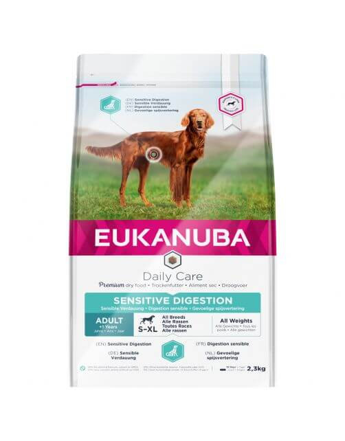 Ein 100% ausgewogenes Rezept für deinen erwachsenen Hund, der unter einer empfindlichen Verdauung leidet, das ist Eukanuba Daily Care Sensitive Digestion. Dieses Trockenfutter ist für erwachsene Hunde aller Größen und Rassen ab 1 Jahr geeignet.