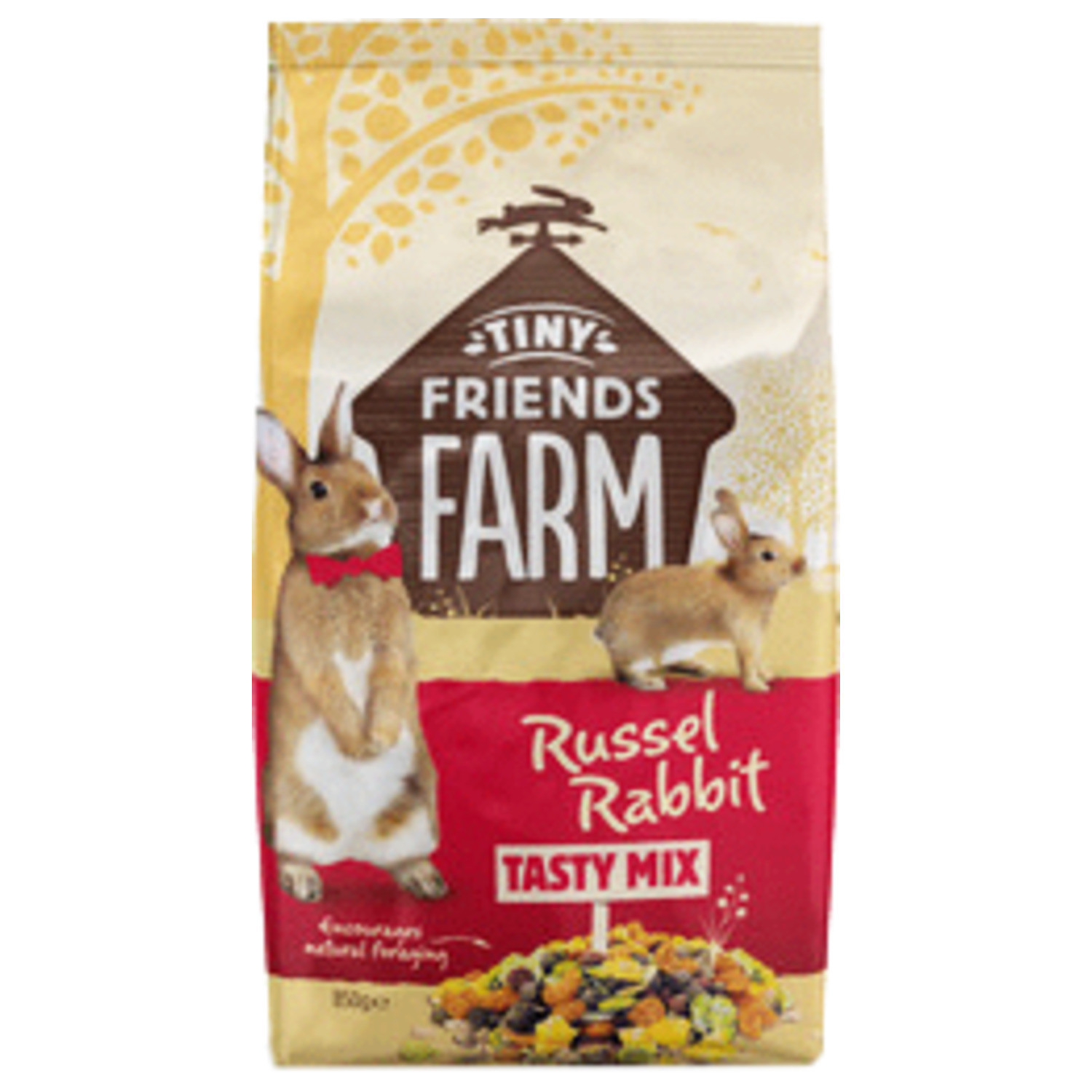 Tiny Friends Farm Russel Rabbit Tasty Mix is verkrijgbaar in 850 g, 2,5 kg, 5 kg en 12,5 kg.