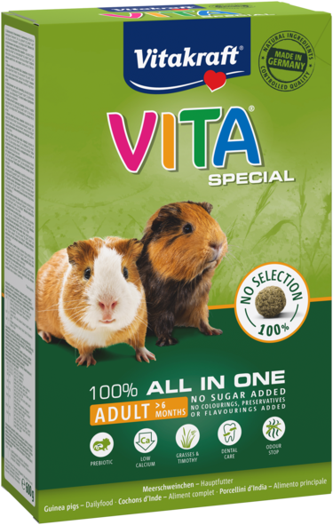 Vitakraft VitaSpecial cavia is een all-in-one voedingsbrok voor cavia's, samengesteld met alle essentiële voedingsbestanddelen en een hoog gehalte aan ruwe vezels. Dit is belangrijk voor de spijsvertering en het afslijten van de tanden. De voeding bevat heerlijke grassen en kruiden, evenals prebiotische inuline voor een gezonde darmflora en immuunsysteem. Daarnaast zijn waardevolle omega 3 en omega 6 vetzuren toegevoegd voor een glanzende, gezonde vacht en huid. Het gereduceerde calciumgehalte helpt bij het voorkomen van blaasstenen. De Odour Stop formule absorbeert onaangename geurtjes op natuurlijke wijze. VitaSpecial cavia is suikervrij en bevat geen kunstmatige kleurstoffen, smaakversterkers en conserveringsmiddelen. Ontwikkeld door dierenartsen.
